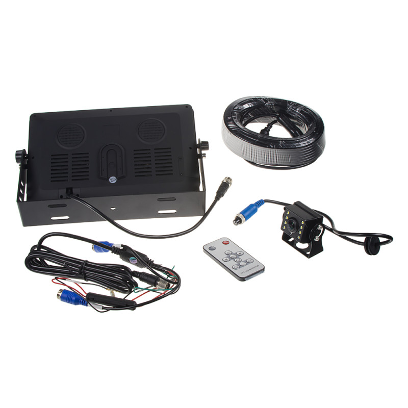V balení je 9" LCD AHD monitor + AHD 720P kamera + 15 m propojovací kabel 4PINový + dálkové ovládání.