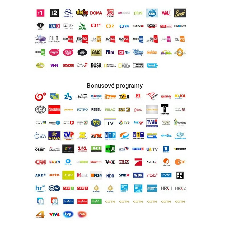 SLOVENSKÉ Jednotka | Dvojka | :24 | Markíza | Markíza +1 | DajTo | Doma | JOJ | JOJ Plus | WAU |ČESKÉ ČT1 | ČT2 | ČT3 | Nova International | Prima Plus | Barrandov | Barrandov Krimi |SPRAVODAJSKÉ TA3 | ČT24 | RTR Planeta | Russija 24 | Pervyj Kanal | UA TV | Ukraina 24 | Armenia 1 TV | TRT World | VOX | Al Jazeera English | France 24 English | CGTN | CGTN Français |VEREJNOPRÁVNE CS Mystery | RTL Zwei | HR | Al Jazeera | Rai Uno | Rai Tre | CGTN Español | CGTN Russkij | Canal 24 Horas |Životný štýl Fashion TV Czech & Slovak | SuperYacht TV | Kitchen TV | TV Natura | TV8 | N-TV | 3sat | France 24 Arabic |REGIONÁLNÉ telKE | TV Región | Mestská Tv Košice | RVTV | Mestská TV Vranov | Miestna TV Trebišov | Mestská Tv Poltár | HN TV | BTV | Moldava TV | TV 9 | TV7 | ČSRTV | TV SEN | TV Ružinov | TV Severka | TV Bratislava | TV RAJ | Tv Vega | TV Panoráma | Televízia Východ | TV Zemplín | TV Poprad | Mestská Televízia Partizánske | TV Považie | Mestská Televízia Trnava | CETV | TV Nitrička | Západoslovenská TV | TV Vita | Régió TV | TV LocAll |HUDOBNÉ Senzi | Šláger Premium | Šláger Originál | Šláger Muzika | Óčko Black | Óčko Expres | Óčko Star | Retro Music Television | Rebel | CROTV | Kabel Eins | Arte | NDR |RODINNÉ Relax | Qazaq TV | RTL Nitro | Super RTL | SAT 1 | ZDF | ARD | Sixx | MDR | TV SLO1 |FILMOVÉ JOJ Cinema | FilmBox | AXN | KiKa | WDR | RBB | BR | CGTN Arabic |ŠPORTOVÉ RTVS Šport | Joj Šport | Chuck TV | Arena Sport 1 | Arena Sport 2 | Auto Motor und Sport | Golf Channel | Motors Tv | TV SLO2 |DOKUMENTÁRNE Hobby TV | PRO 7 | CGTN Documentary | CCTV 4 |Detské Jojko | RiK TV | RTL | SWR |Erotické WELT | EXTASY TV 4K |INÉ HaHa TV | Arcadia TV | TV LUX | NOE | TV Piánko | Balkan TV | Life TV | TV Nové Zámky |