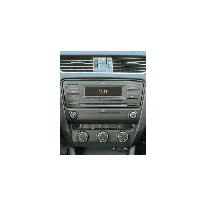 Plastový adaptér stříbrné barvy slouží pro montáž rádia do vozu Škoda Octavia bez Climatroniku.