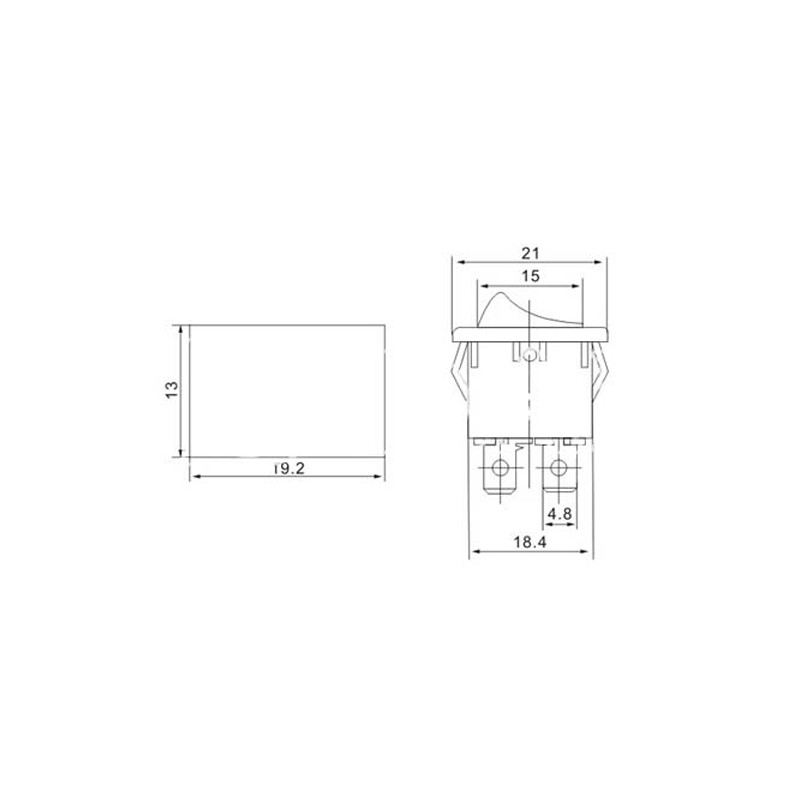 Univerzální kolébkový přepínač hranatý 6A/125V, rozměry motážního otvoru 13 x 19 mm, symboly I - II.