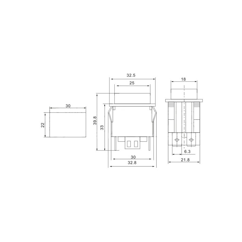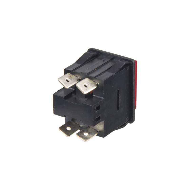 Tlačítko hranaté 2x 15 A / 250 V, červené tlačítko, rozměr otvoru 22 x 30 mm.
