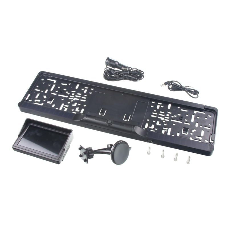 Sada LCD monitoru 5" a kamery s 2 čidly integrované do SPZ rámečku se solárním napájením s bezdrátovým digitálním přenosem signálu.