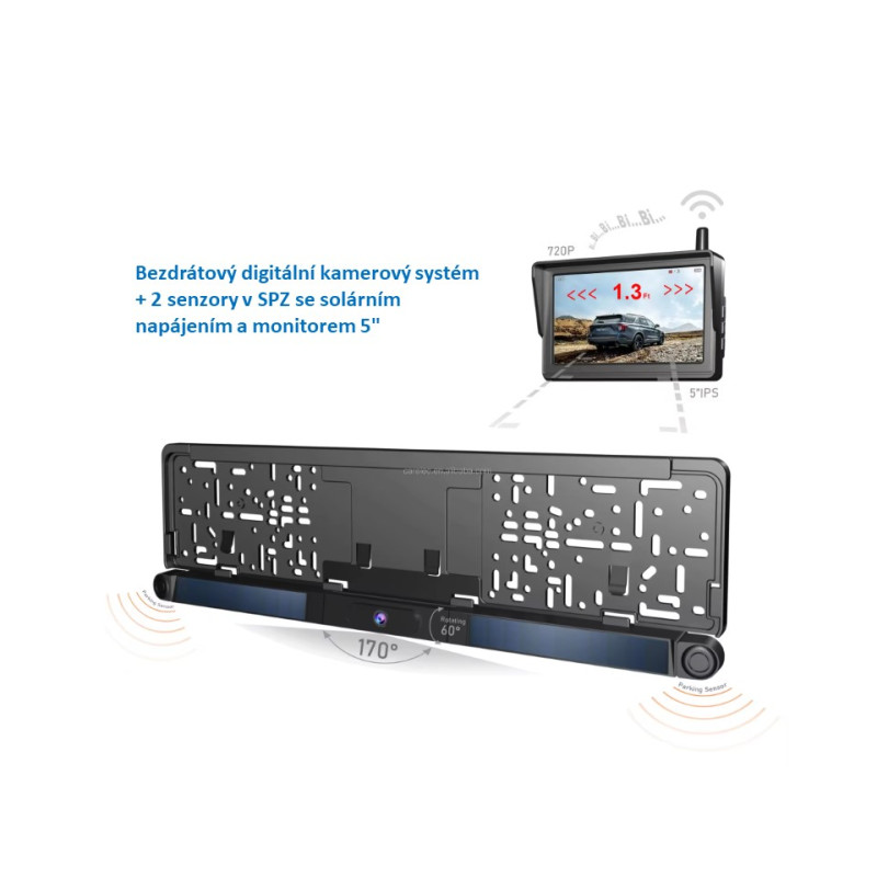 Sada LCD monitoru 5" a kamery integrovanou do SPZ rámečku se solárním napájením s bezdrátovým digitálním přenosem signálu. Digitální kódovaný přenos signálu zajišťuje velmi kvalitní přenos signálu, odolný jakémukoliv rušení a výpadkům. Hlavní výhoda tohoto systému spočívá ve velmi jednoduché montáži bez nutnosti tažení kabelů a možnosti napárování 1 kameru.