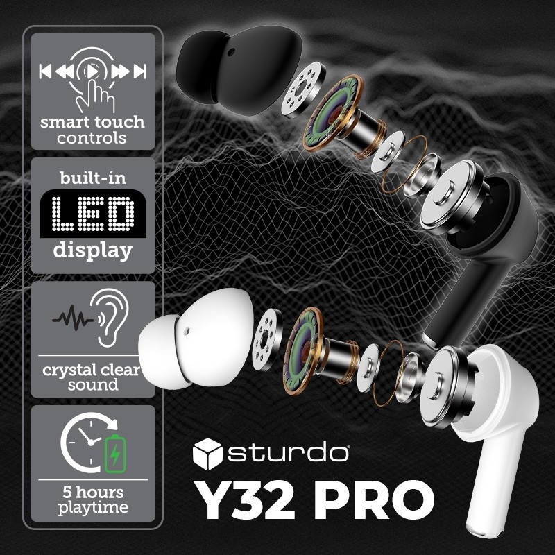 Bezdrôtové slúchadlá Sturdo Y32 Pro ponúkajú kvalitný zvuk, intuitívne dotykové ovládanie a moderný dizajn s praktickým LED displejom na nabíjacom puzdre. Vďaka hydroizolačnému TPU materiálu sú pohodlné a ideálne na každodenné používanie.Hlavné vlastnosti:- Smart touch ovládanie – jednoducho prepínajte skladby, prijímajte hovory alebo aktivujte hlasového asistenta dotykom- LED displej – prehľadné zobrazenie stavu nabitia slúchadiel a puzdra- Krištáľovo čistý zvuk – vďaka 13 mm meničom a BT 5.3 technológii- Až 5 hodín prehrávania na jedno nabitie + ďalšie nabitia cez puzdro- Bezdrôtový dosah až 10 metrovTechnická špecifikácia:- Impedancia: 32 ? ± 5 %- Citlivosť: 115 ± 3 dB- Frekvenčný rozsah: 20 Hz – 20 kHz- Bluetooth verzia: 5.3- Batéria slúchadlá: 35 mAh- Batéria puzdro: 230 mAh- Nabíjanie: USB-C, do 2 hodín- Výstup: 5 V / 35 mAObsah balenia:Slúchadlá, nabíjacie puzdro, USB-C kábel, používateľský manuál.Kompatibilné s: iOS aj Android zariadeniami.