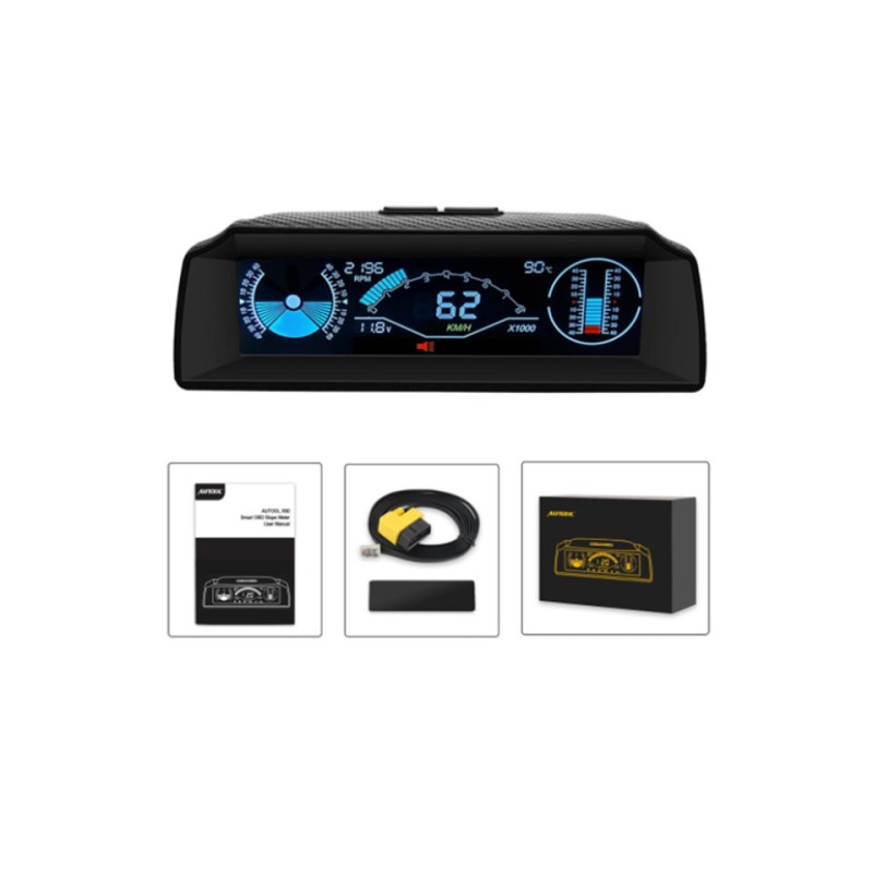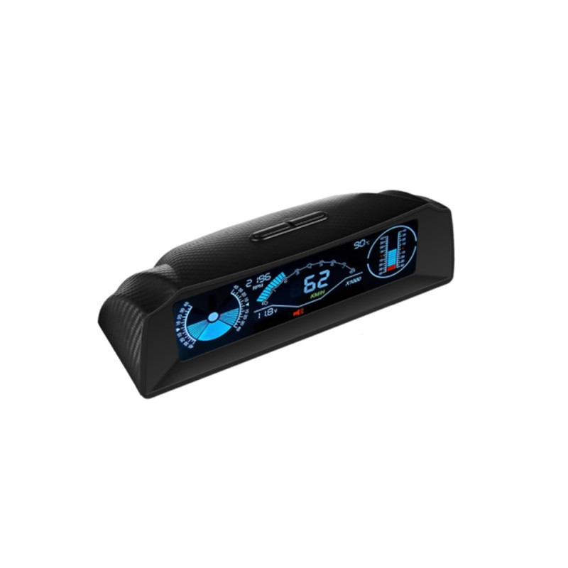 Palubní OBD displej s vestavěným víceosým gyroskopem, který dokáže měřit sklon a náklon, stupeň sjezdu a stoupání vozidel během jízdy, údaje o rychlosti, otáčky motoru, teplotu chladící kapaliny, napětí baterie a další údaje na přehledném barevném LCD displeji.