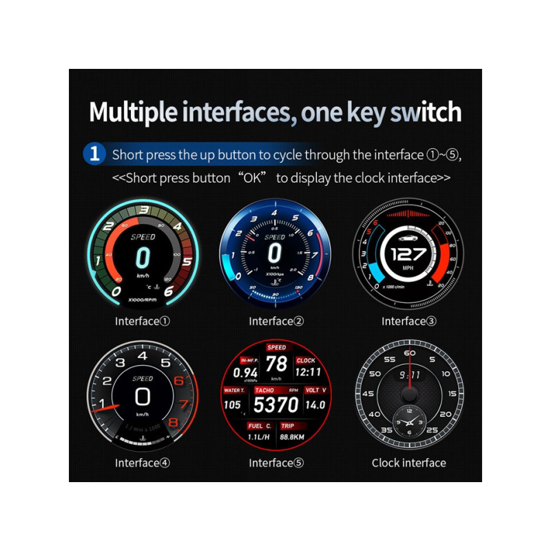 Palubní displej (počítač), během jízdy zobrazuje údaje o rychlosti, otáčkách motoru a další údaje na přehledném barevném LCD displeji. Displej se připojuje pouze do diagnostického konektoru OBD a veškeré údaje si vyčítá sám z datové sběrnice vozidla nebo a lze se přepnout na systém GPS a přesnou rychlost si zjišťuje sám podle signálu GPS.