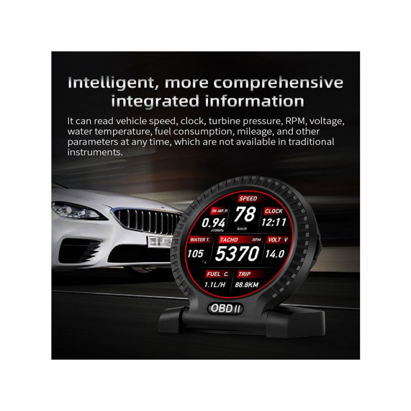 Palubní displej (počítač), během jízdy zobrazuje údaje o rychlosti, otáčkách motoru a další údaje na přehledném barevném LCD displeji. Displej se připojuje pouze do diagnostického konektoru OBD a veškeré údaje si vyčítá sám z datové sběrnice vozidla.