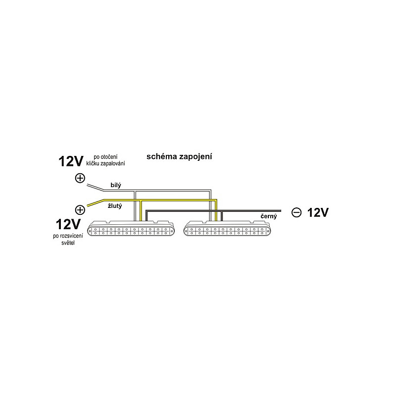 - pozor světla jsou zapojena do serie a tak při zapojení jednoho světla nesvítí. Nelze zapnout na 12 V bez jednotky