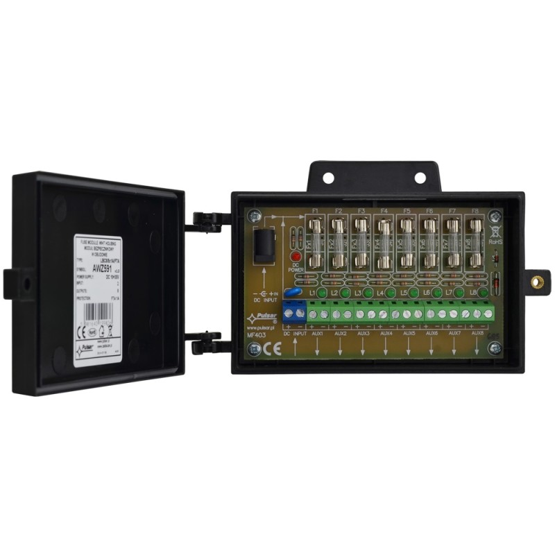 ► Napájanie: 0÷30VDC► Výstup napájania: 8x1A - PTC► Prierez vodiča: max. 2mm2► Počet vstupov/výstupov: 2/8► Zabezpečenie: SCP, OLP*, prepäťové► Dodatočný vstup napájania - konektor DC 5.5/2.1,► Optická signalizácia LED► Prepojky odpojujúce napájanie na výstupoch AUX1 ÷ AUX8 (svorka „+“)► Možnosti montáže: na stenu – montážne skrutky x 2, na plochu – lepiaca páska► Rozmery: W=150, H=94, D=42 (+/-2mm)