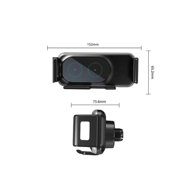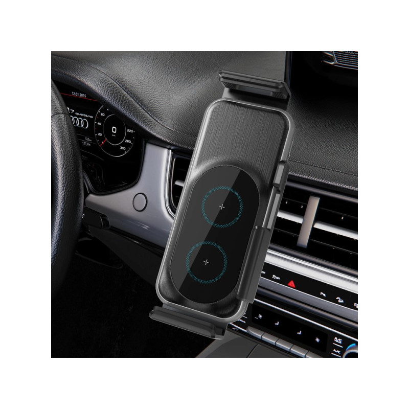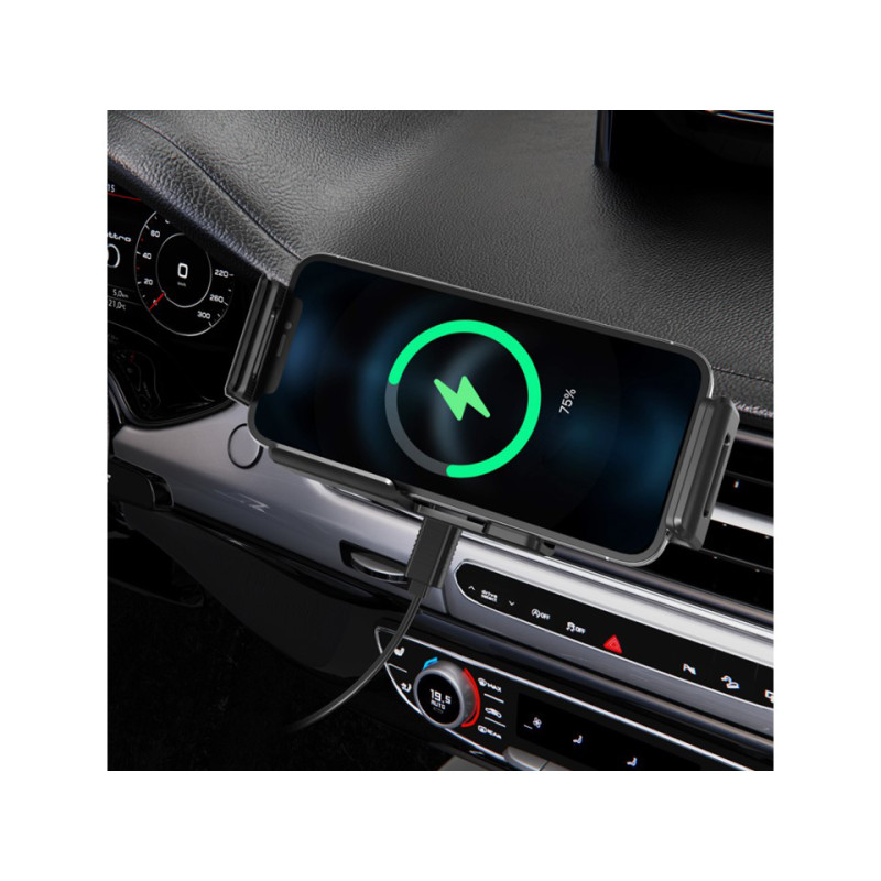 Součástí držáku je bezdrátové nabíjení pomocí standartu QI, světelné indikátory indikují stav držáku a nabíjení pomocí různých barev.