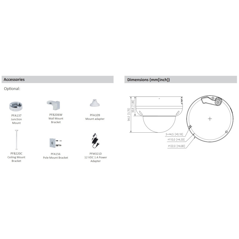► 8 Mpx (2x 4 Mpx) dome panoramatická IP kamera, exteriérová, Day/Night, IR LED s dosvitom 25 m, viditeľný prísvit 20 m, Dual 1/2.7" 2x 4 Megapixel progresívne CMOS, rozlíšenie 4096 x 1860 px @ 1-20 fps, citlivosť 0,005 lx @ F1.4 (Color, 30 IRE), objektív 2,8 mm, uhol záberu H: 180°, V: 86°, AWB, BLC, HLC, WDR, 3DNR, AGC, ROI, Defog, Inteligentné funkcie: IVS (Perimeter Protection), SMD 4.0, Quick Pick, Smart Search, EPTZ, kompresia H.265 / H.264 / H.264H / H.264B / MJPEG (Sub Stream), podpora smart a AI codekov, ONVIF kompatibilné, slot na MicroSD kartu až 256 GB, vstávaný duálny mikrofón a reproduktor, RJ-45, Audio I/O 1/1, Alarm I/O 1/1, napájanie 12 V DC / PoE(802.3af), pracovná teplota od -40 °C do +60 °C, IP 67, rozmery ø122,0 x 135,2 mm