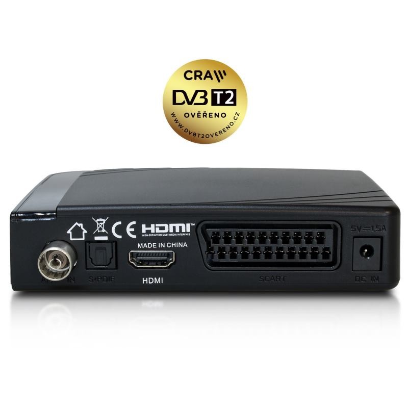 ► Prijímač získal označenie DVB-T2 ověřeno s logom CRA, ktoré dokazuje, že bol overený Českými Radiokomunikacemi a úspešne prešiel testom pre príjem nového vysielania. Certifikát sa zobrazí po kliknutí na obrázok loga DVB-T2 ověřeno.► Prijímač je určený pre terestriálne a káblové vysielanie v najnovších normách DVB-T / DVB-T2 a DVB-C s podporou kodeku H.265 HEVC. Jednoduché maličké prevedenie vhodné aj na umiestnenie za TV prijímač. Obsahuje jednu čítačku kariet, HDMI výstup, Scart výstup pre staršie TV prijímače, USB 2.0, S/PDIF optický audio výstup a vstup pre externé IR čidlo (IR čidlo nie je súčasťou balenia, dá sa dokúpiť ako príslušnstvo). Možnosť multimediálneho prehrávania v plnom Full HD 1080p rozlíšení. Nahrávanie programov je možné v reálnom čase alebo cez jednoduché časové nahrávanie z EPG. EPG sprievodca na 7 dní. Balenie obsahuje externý zdroj a diaľkové ovládanie. 1 x DVB-T2/C tuner (HEVC/H.265 l AVC/H.264) 1 x čítačka kariet 7-segmentový štvormiestny displej 1 x HDMI 1 x SCART 1 x USB 2.0 1 x S/PDIF optický digitálny audio výstup