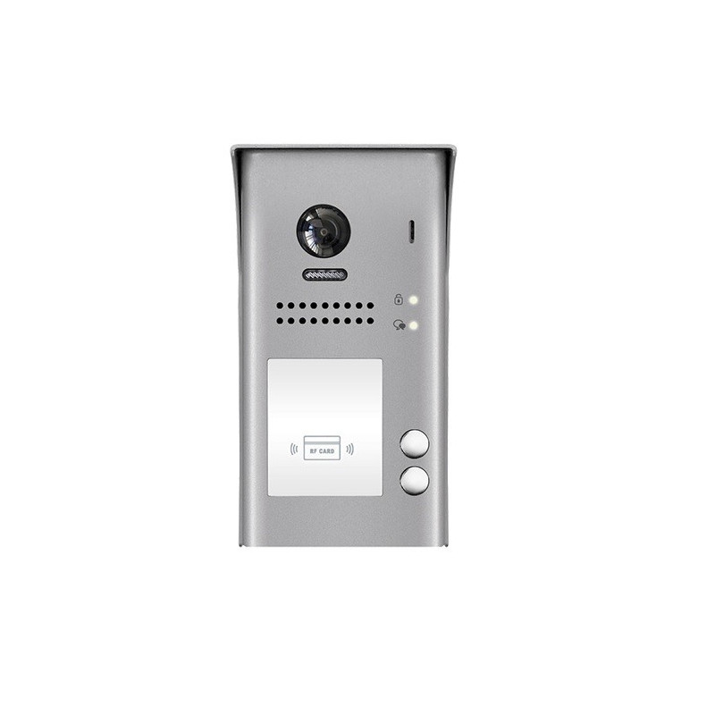 ► Dvojtlačidlová kovová dverná jednotka pre dvojvodičový systém Easydoor. Zariadenie má integrovanú RFID čítačku pracujúci na frekvencii 125 kHz, podsvietený menný štítok, LED indikáciu a krytie IP 43. Vstavaná farebná kamera zaberá scénu v uhle 170° a je vybavená LED prisvietením pre nočný režim.► Dverná kamerová jednotka farebná s dvoma tlačidlami a 125 kHz RFID čítačkou, kapacita 320 kariet, podsvietená menovka a LED indikácia, prevedenie kov, prisvetlenie snímaného priestoru, širokouhlá kamera 170°, IP 43, 12 V DC alebo relé ovládanie pre 1 zámok, pridávanie/odoberanie kariet cez master karty, rozmery 179 x 94 x 42 mm, so strieškou, napájanie 24 V DC zo zbernice systému, montáž na omietku, dvojvodičový systém zapojenia – nepolarizovaný, odporúčaný netienený krútený pár, min. 2x 1 mm