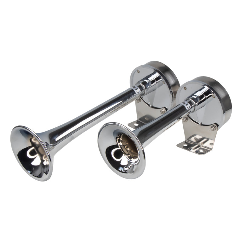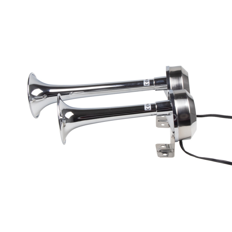 2-trubková elektromagnetická fanfára, chromová, nerezová + ABS plast, hluboký tón.