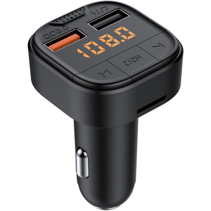 MP3/FM bezdrátový modulátor elegantně přenáší audio soubory nebo hovor z přehrávače / telefonu do rádia, pomocí BLUETOOTH technologie lze bezdrátově spojit přehrávač / telefon s MP3/FM modulátorem či přehrávat soubory přímo z instalovaných USB nebo micro SD slotů.Dodatečné zabudování připojení je většinou moc drahé. FM modulátor je možno dále využít jako BLUETOOTH HANDSFREE, jelikož vně modulátoru je instalován interní mikrofon.Modulátor disponuje funkcí možností nastavení zvlášť výšky nebo basy, pro dokonalejší a výraznější zvuk.Vlastnosti• 1,8 " (4,5 cm) TFT LCD zobrazuje nastavení frekvence modulátoru, zapnutí funkce BLUETOOTH, při hovoru telefonní číslo / čas hovoru, přehrávaného interpreta, nastavení hlasitosti, pořadí přehrávaného souboru, stav palubního napětí atd.• BLUETOOTH verze: 5.0• AUX-IN vstup pro připojení externího zařízení, Jack 3,5 mm• možnost přehrávání formátů: MP3, WMA, WAV, FLAC• velikost paměťového média: Max. 32 GB• funkce ekvalizéru (normální, klasika, pop, rock, jazz)• napájecí napětí 12 / 24 V• modulátor zároveň slouží jako nabíječka• podporuje iPod/iPhone, mobilní telefony a další zařízení• 2 x USB port: 5 V / 1 A + QC3.0• drží poslední přehrávanou skladbu v paměti, takže při novém startu začneme tam, kde jsme minule skončili• můžete poslouchat hudbu přes USB port nebo Bluetooth a současně nabíjet mobilní telefon nebo jiné zařízení• měřič palubního napětí automobilu• nastavitelný kloub pro snadnější používání• AUX výstup, Jack 3,5 mm – Jack 3,5 mm M / M kabel (součástí balení)• rozsah vysílacích FM frekvencí: 87,5 - 108 MHz• jazyk MENU: čeština, angličtina .........Ovládání• přístroj strčíme do zásuvky zapalovače, na rádiu naladíme stejnou frekvenci nastavenou na FM modulátoru a připojíte přes USB port nebo Bluetooth MP3 přehrávač či mobilní telefon.