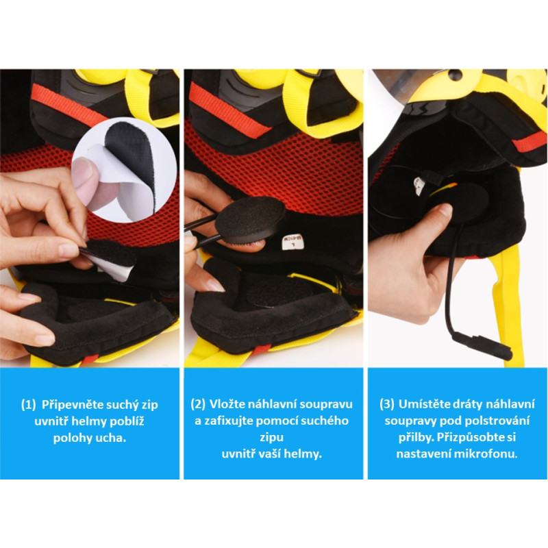 - Obsah balení: jednotka integrována do stereo sluchátek s mikrofonem na pružném držáku proti-šumovým filtrem, sada nalepovací suché zipy, 1x USB kabel.