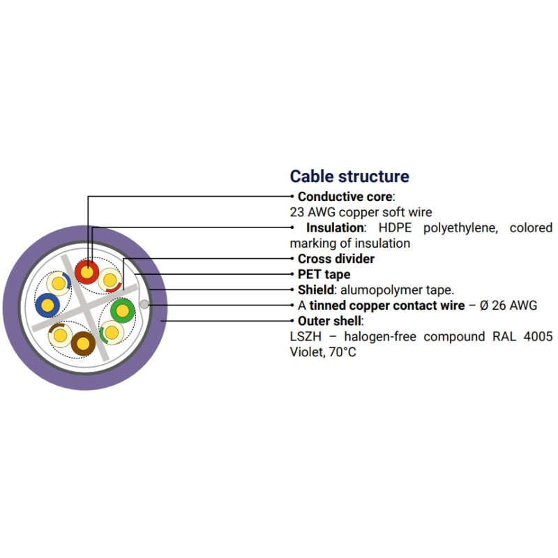 ► 8-žilový FTP kábel s krútenými pármi, tienením a plstovým svevňovacím krížom, aby bol menej zraniteľný voči vonkajším elektrickým vplyvom pre štruktúrovanú kabeláž na prevádzku (napr. až 10GigabitEthernet) v náročnejšom vnútornom prostredí, kde je možné elktormagnetické rušenie