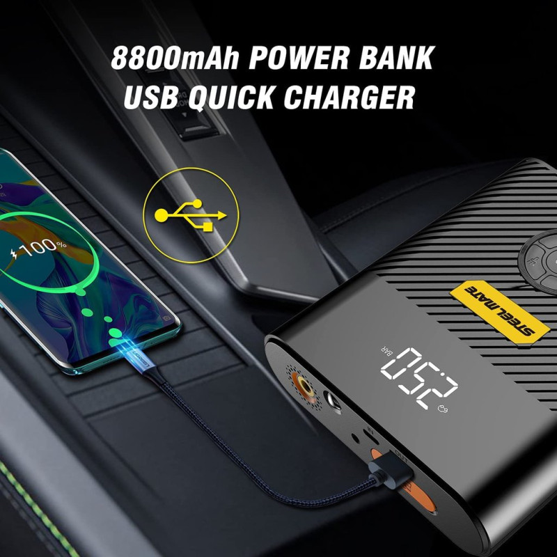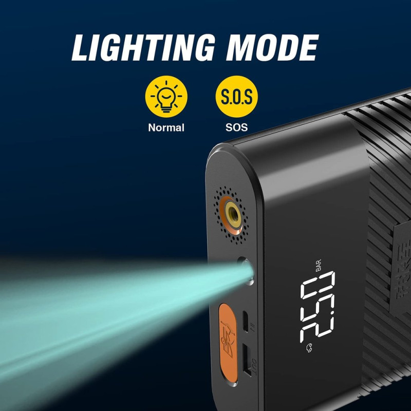 ► Prenosný vzduchový kompresor s presným digitálnym displejom vám zjednoduší život. Viac ako len pumpa na pneumatiky, ale aj 8800 mAh batéria na nabíjanie zariadení, svietidlo a Jumpstarter