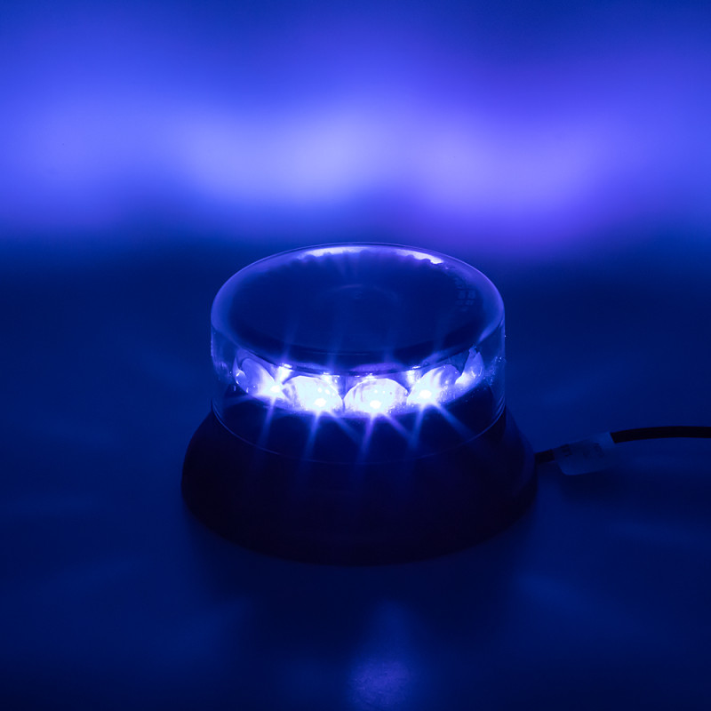 Profesionální modrý LED maják s výrazným výstražným efektem. Určen pro montáž na držák (hrot). Napájení je realizované pomocí konektoru v hrotu (držáku) majáku, kde jsou volné vodiče pro připojení napájecího napětí.