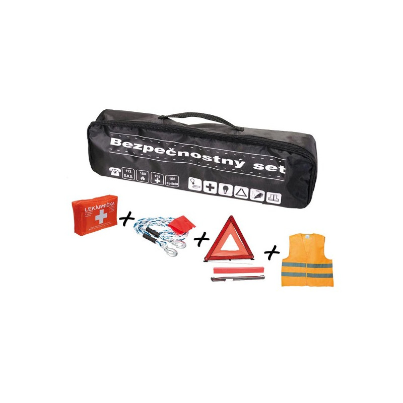► Obsah: - autolekárnička + výstražný trojuholník + lano na ťahanie auta do 1800 kg + vesta bezpečnostná - oranžová