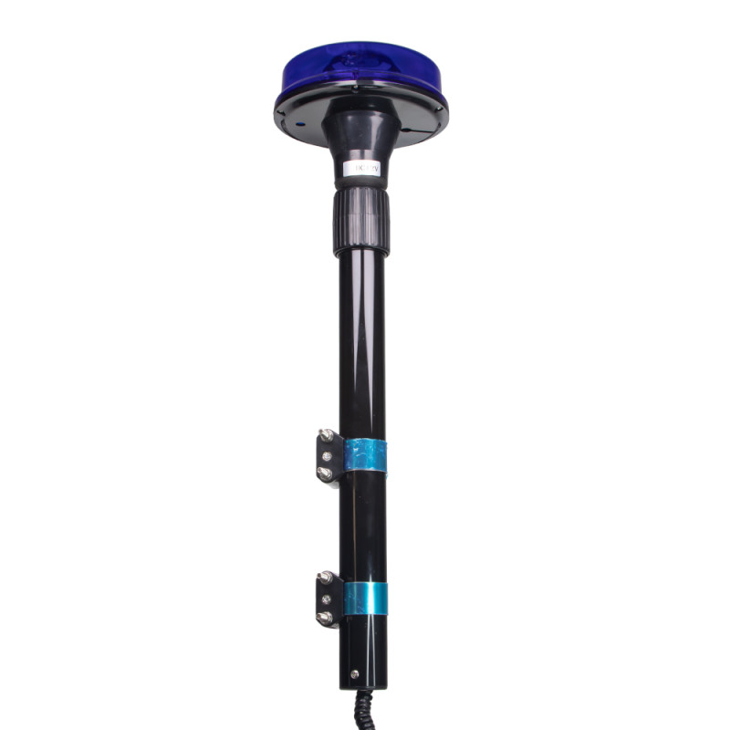 ModrýLED maják s výrazným výstražným efektem, speciální optika (čočky) s teleskopickou tyčí, určen pro montáž na motocykl.