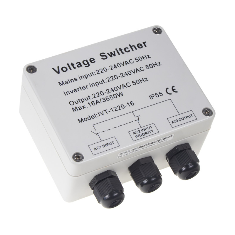 Přepínací stanice umožňuje zvolit preferovaný zdroj napájení.Zabudovaná relé zaručují přesný spínací práh a ochranu měniče před vnějším napětím.