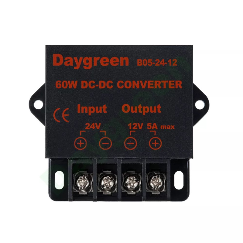 Nové provedení měniče stejnosměrného napětí 24 V (13 V - 40 V) na 12 V, max. zatížení 5 A, ochrana proti přetížení.