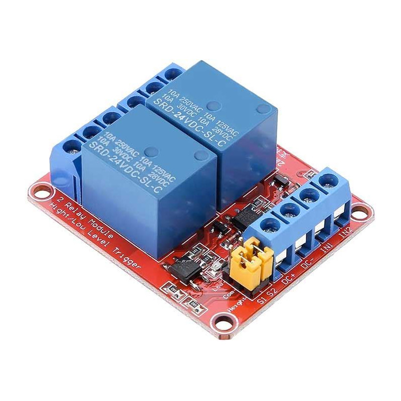 1 kanálový relé modul s napájecím napětím 24V osazen optočlenemSamotná relé se spínají uzemněním příslušného pinu.Specifikace:Pracovní napětí 24VRelé: Songle SRD-xxVDC-SL-CPřepínacíkontakt relé 250VAC/10ASpouštění: log.0, GND, proud 5mAKompatibilní s Arduino, AVR, PIC, ARM atdLED indikátor stavu reléRozměry: 53×18×18,5mm
