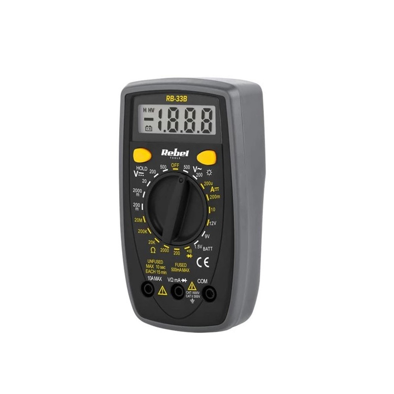 - Podsvietený displej- Ručná zmena meracích rozsahov- Rozšíriteľný stojan- Zmrazenie posledného údaja- Indikátor vybitia batérie- Polarita: automatická- Vzorkovacia frekvencia: 2krát za sekundu- Maximálny odpočet: 1999- Veľkosť displeja: 45 x 21 mm- Prevádzková teplota: 0 ° C ~ 40 ° pri vlhkosti < 80%- Skladovacia teplota: -10 ° ~ 50 ° C pri vlhkosti <85%- Napájanie: 2x batéria AAA- Rozmery: 160 x 76 x 32 mm- Hmotnosť: 150 gRozsahy merania- DC napätie: 200 mV, 2V, 20V, 200V, 1000V ± (1% + 5)- AC napätie: 200 V, 750 V ± (2% + 10)- DC prúd: 200 µA, 2 mA, 20 mA, 200 mA, 10 A ± (2% + 10)- Odpor: 200 Ohm, 2 KOhm, 20 KOhm, 200 Ohm, 2 MOhm ± (1% + 4)- Test batérie: 1,5 V, 9 V, 12 V- Test diód- Test hFE tranzistorov- Test kontinuityObsah balenia: merač, meracie káble.