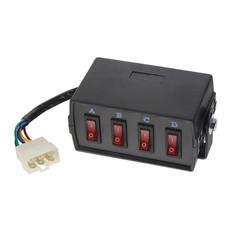 Panel se 6-ti přepínači, vhodné např. pro přídavná doplňková světla, majáky, predátory a světelné aleje. Obsahuje 6 spínačů s červenou LED kontrolkou v zapnuté poloze. Upevnění pomocí plechového držáku (součást balení).