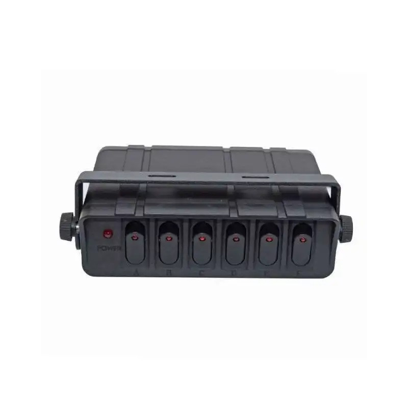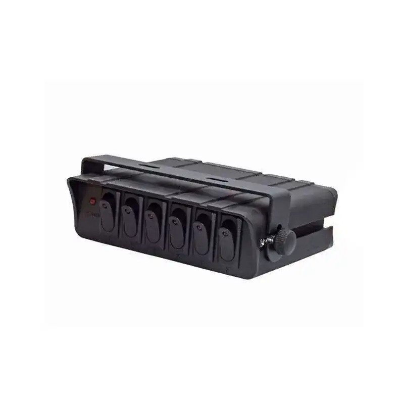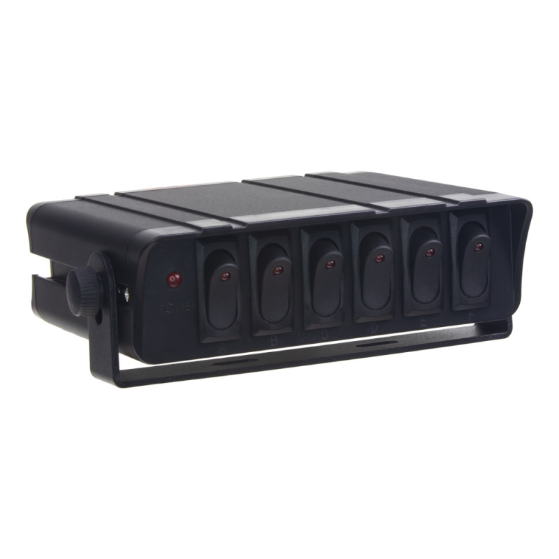 Panel se 6-ti přepínači, vhodné např. pro přídavná doplňková světla, majáky, predátory a světelné aleje. Obsahuje 6 spínačů s červenou LED kontrolkou v zapnuté poloze. Upevnění pomocí plechového držáku (součást balení).