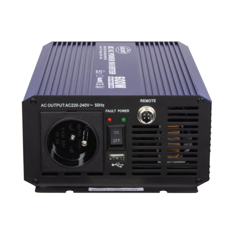 Sinusový měnič vhodný pro napájení všech druhů spotřebičů s odporovou zátěží i pro spotřebiče s indukční zátěží jako jsou motory, čerpadla, ledničky, zářivky atd. Dále je tento měnič vhodný pro spolehlivé a bezpečné napájení televizorů, DVD, počítačů, tiskáren, měřících přístrojů a jiných el. spotřebičů. Měnič je navíc vybaven USB zásuvkou pro napájení USB spotřebičů 5 V.