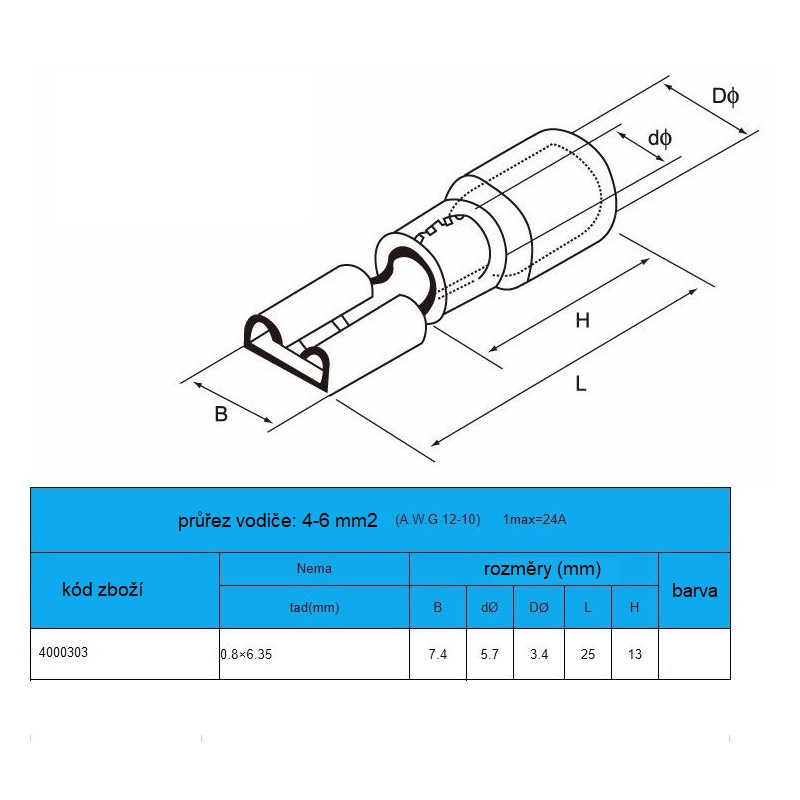 • připojení vodičů: ploché konektory 6,3mm + 4,8mm (slitina mědi a zinku )