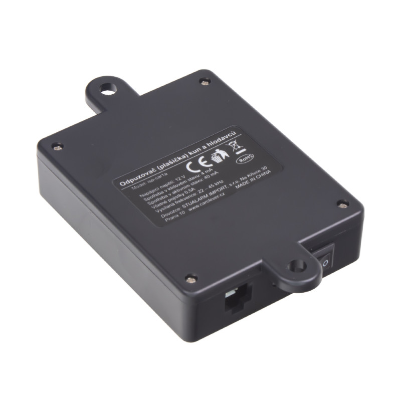 Špičkový odpuzovač - plašič škůdců určený pro ochranu automobilů a zemědělských strojů. Žádné líčení speciálních pastí, žádné zabíjení jinak užitečných zvířat! Šetřete životní prostředí! Toto zařízení Vám poslouží k ekologickému odhánění kun z vašeho automobilu, zemědělského stroje, garáže i lodě (prokousávání pneumatik a ohlodávání kabelů a plastových částí). Tento přístroj vyhání a odpuzuje nejen šelmy kunovité (kuny, tchoře), ale i šelmy lasicovité. Vestavěné dva systémy pro odpuzování kun a drobných hlodavců. Přístroj odpuzuje škůdce jednak pomocí pro ně agresivního ultrazvukového signálu, zároveň odpuzuje pomocí blikajícího světla a jednak pomocí 6ks vysokonapětových kontakních destiček. Pokud se škůdce dotkne jedné z vysokonapěťových destiček, dostane elektrickou ránu, která jej přesvědčí o tom, že pobyt ve vašem automobilu je pro něj nemožný. Do toho na něj působí agresivní ultrazvukový signál, který je pro něj stejně příjemný, jako pro člověka pobyt vedle houkající požární sirény. Vysoké napětí na kontaktních destičkách není pro člověka nebezpečné. Hluk (zvuk), který přístroj vysílá, lidské ucho téměř neslyší. Každých 22 sekund po dobu 22 sekund (s přerušením dalších 22 sekund) vysílá tento přístroj velmi vysoký tón (o frekvenci 12 - 24 kHz).