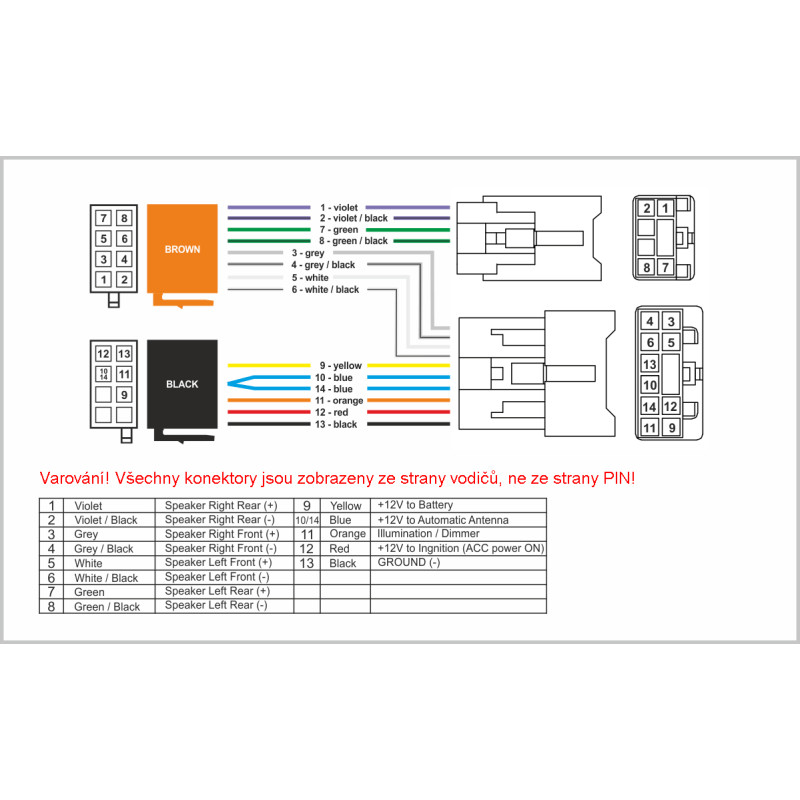 U některých novějších modelů (2017-) je spínané napětí (červený vodič) umístěn místo v pozici 2 konektoru, v pozici 3!