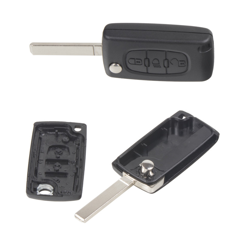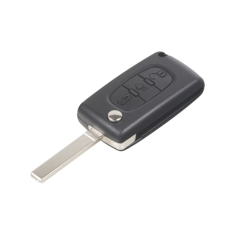 Náhradní obal vystřelovacího klíče pro vozy Citroën/Peugeot s 3-tlačítkovým vystřelovacím klíčem (bez elektroniky a čipu imobilizéru). Slouží pro změnu ze staršího vystřelovacího klíče na novější verzi. Do vystřelovacího klíče je nutno vložit z původního klíče elektroniku dálkového ovládání a čip imobilizéru (transpondér), planžetu klíče je třeba nechat vyfrézovat podle tvaru originálního klíče.