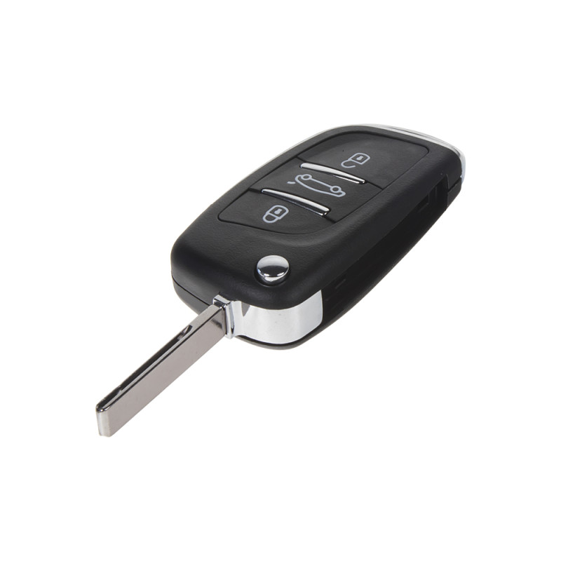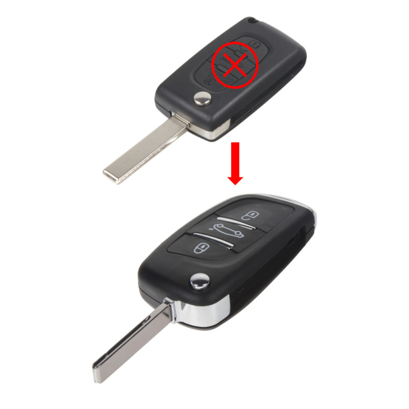 Náhradní obal vystřelovacího klíče pro vozy Citroën/Peugeot s 3-tlačítkovým vystřelovacím klíčem (bez elektroniky a čipu imobilizéru). Slouží pro změnu ze staršího vystřelovacího klíče na novější verzi. Do vystřelovacího klíče je nutno vložit z původního klíče elektroniku dálkového ovládání a čip imobilizéru (transpondér), planžetu klíče je třeba nechat vyfrézovat podle tvaru originálního klíče.