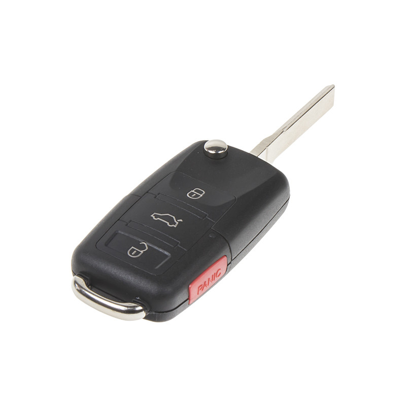 Náhradní obal vystřelovacího klíče pro vozy koncernu VW s 4-tlačítkovým ovladačem - s tlačítkem Panic (bez elektroniky a čipu imobilizéru). Do klíče je nutno vložit z původního klíče elektroniku dálkového ovládání a čip imobilizéru (transpondér), planžetu klíče je třeba nechat vyfrézovat podle tvaru originálního klíče.