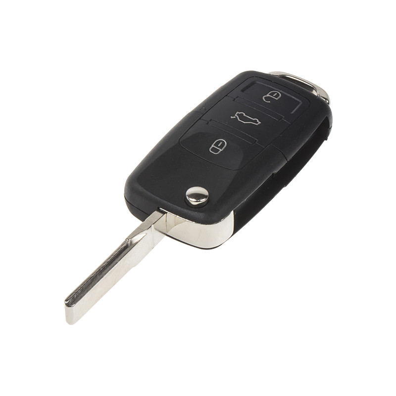Náhradní obal vystřelovacího klíče pro vozy koncernu VW (modely 2011-) s 3-tlačítkovým ovladačem (bez elektroniky a čipu imobilizéru). Do klíče je nutno vložit z původního klíče elektroniku dálkového ovládání a čip imobilizéru (transpondér), planžetu klíče je třeba nechat vyfrézovat podle tvaru originálního klíče.