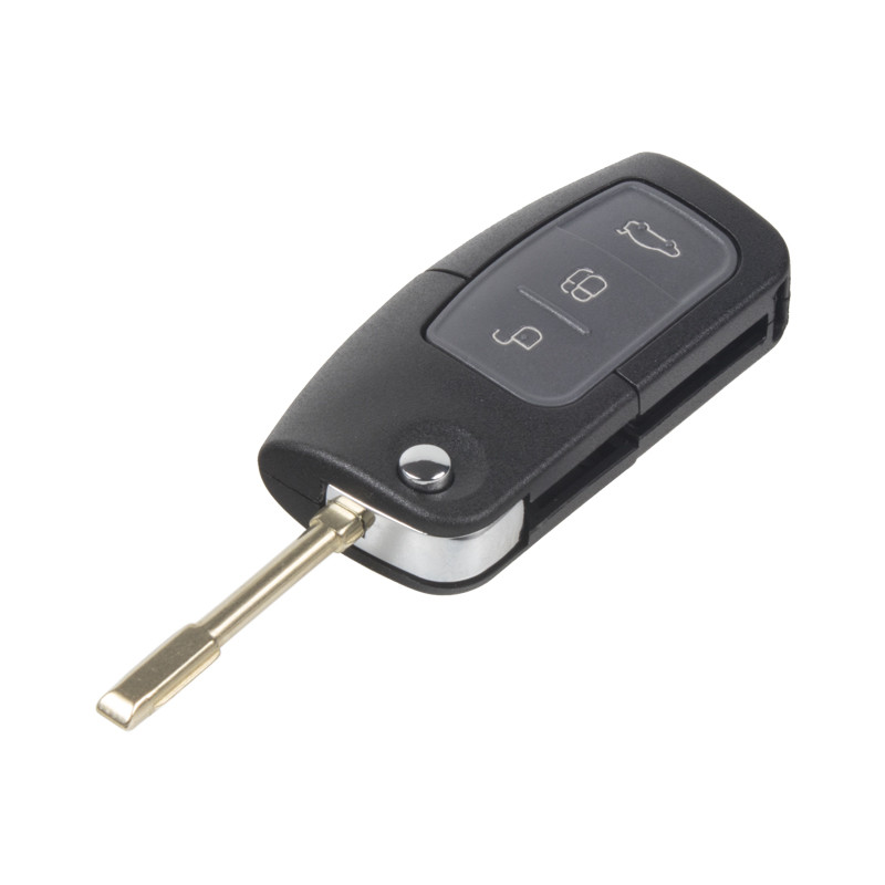 Náhradní vystřelovací autoklíč s dálkovým ovladačem pro vozy Ford. Součástí klíče je planžeta, dálkové ovládání centrálního zamykání se třemi tlačítky a čip 4D63 pro imobilizér (transpondér). Náhrada originálního ovladače.