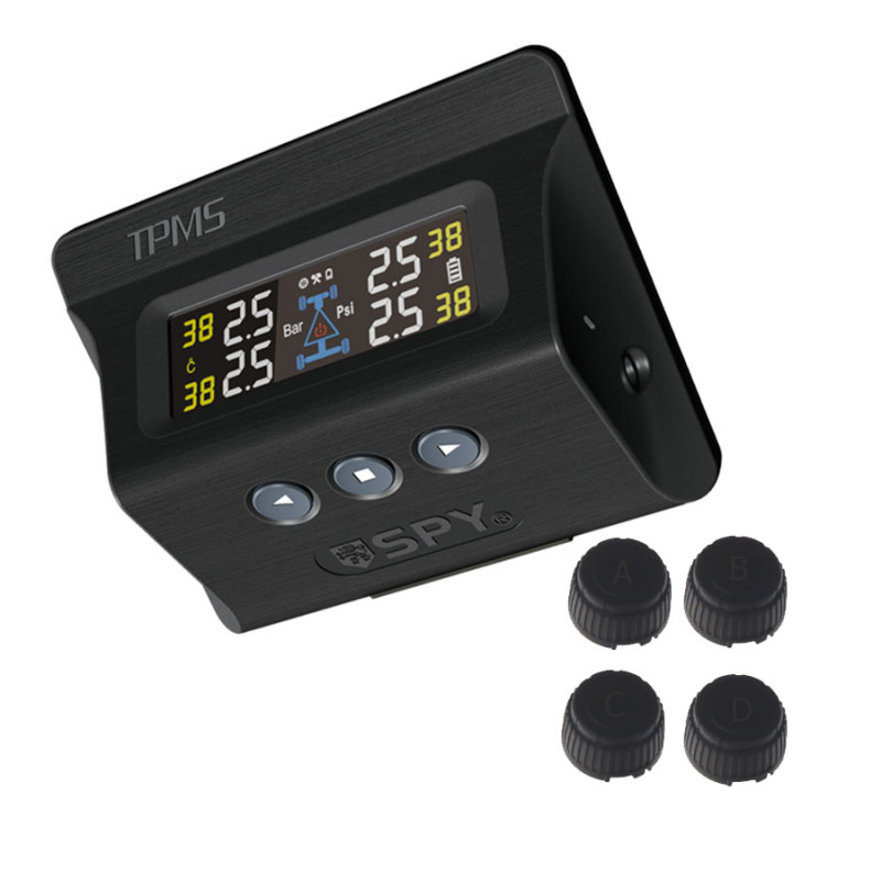 Systém pro kontrolu tlaku a teploty v pneumatikách s displejem a vnějšími senzory. Čidla jsou určena pro vnější montáž, proto montáž zvládnete svépomocí (pouze se vymění čepička ventilku).