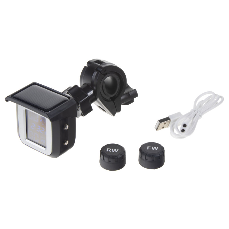 Systém pro kontrolu tlaku a teploty v pneumatikách pro motocykly. Displej se umisťuje na řidítka motocyklu nebo na nalepovací držák. Čidla jsou určena pro vnější montáž, proto montáž zvládnete svépomocí (pouze se vymění čepička ventilku).