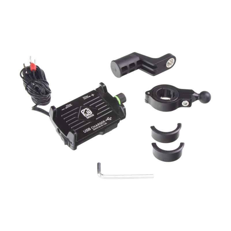 Univerzální hliníkový nastavitelný držák na trubku pro mobilní telefony s USB nabíječkou, vhodný především pro použití na motocyklech a jízdních kolech.
