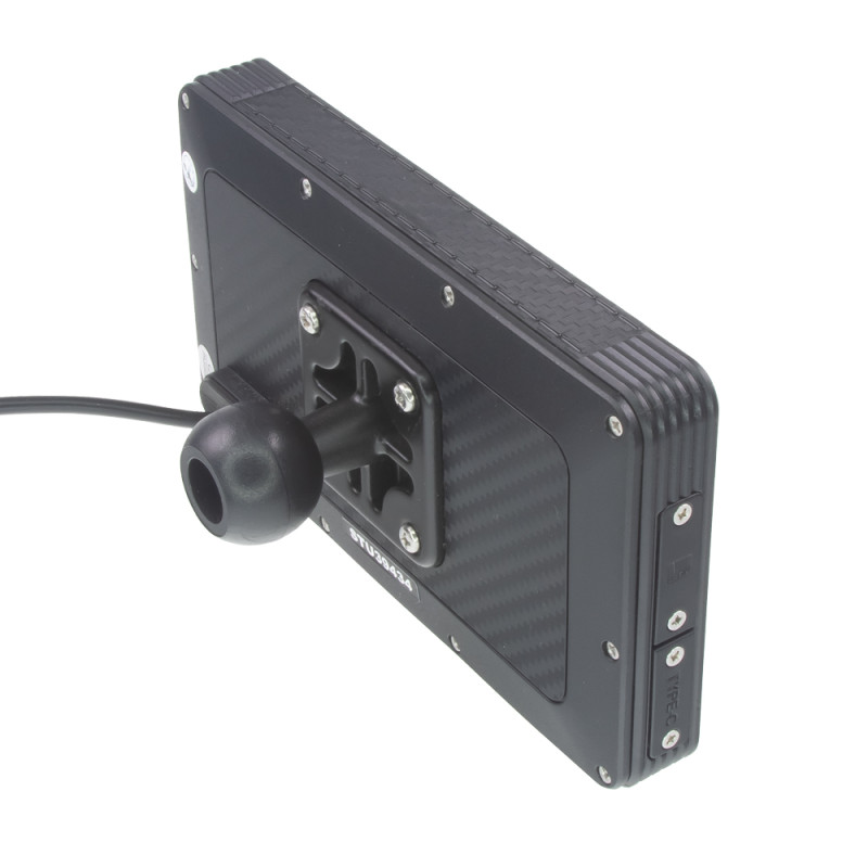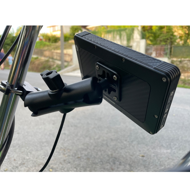 Monitor s dotykovou 5" obrazovkou na motocykl (Plug and Play, vhodné pro všechny motocykly) je dodáván se silným kloubovým držákem s možností instalace na řídítka či pod držák zrcátka.