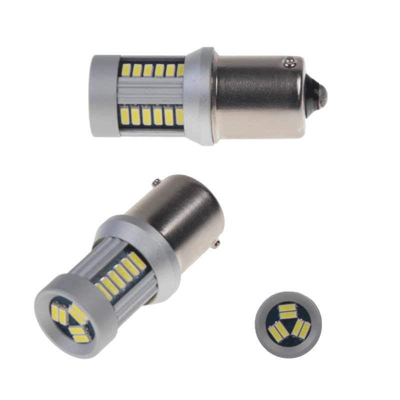 Nová generace LED autožárovek s paticí BA15S, bílá, zepředu 3x super svítivý LED čip 5730SMD, z boku 15x LED čip 5730SMD.