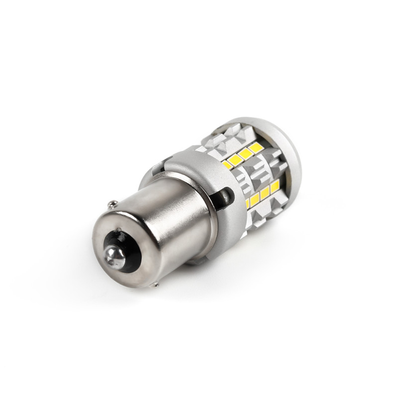 Nová generace LED autožárovek s paticí BA15S, bílá, 30x LED čip 3030SMD. Díky speciální vestavěné elektronice simuluje stejný odběr jako klasická žárovka a nehlásí chybu ve vozidlech se systémem hlídání prasklých žárovek.
