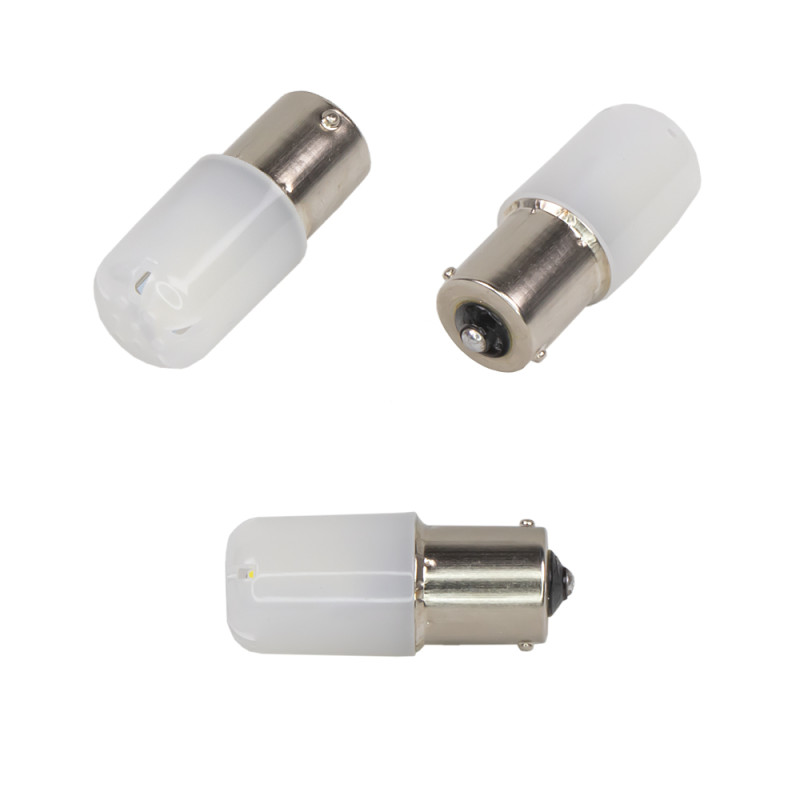 Nová generace LED autožárovek s paticí BA15S (P21 W), bílá, zepředu 1x super svítivý LED čip 3 W + rozptylová krycí čočka, z boku 12 SMD LED.