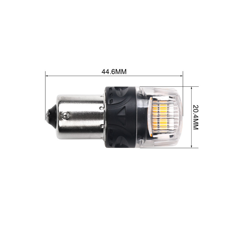 Nová generace LED autožárovek s paticí BA15S, oranžová, 30x LED čip 3030SMD. Díky speciální vestavěné elektronice simuluje stejný odběr jako klasická žárovka a nehlásí chybu ve vozidlech se systémem hlídání prasklých žárovek. Určeno do směrových světel (blinkrů), žárovky blikají správnou rychlostí.