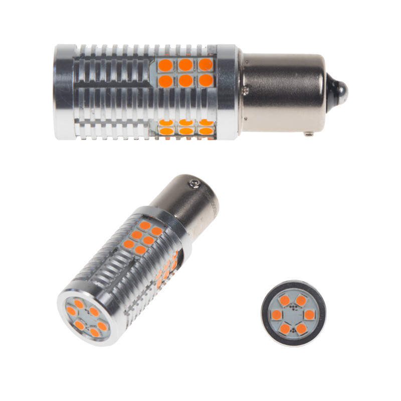 Nová generace LED autožárovek s paticí BAU15S, oranžová, 30x LED čip 3030SMD. Díky speciální vestavěné elektronice simuluje stejný odběr jako klasická žárovka a nehlásí chybu ve vozidlech se systémem hlídání prasklých žárovek. Určeno do směrových světel (blinkrů), žárovky blikají správnou rychlostí.