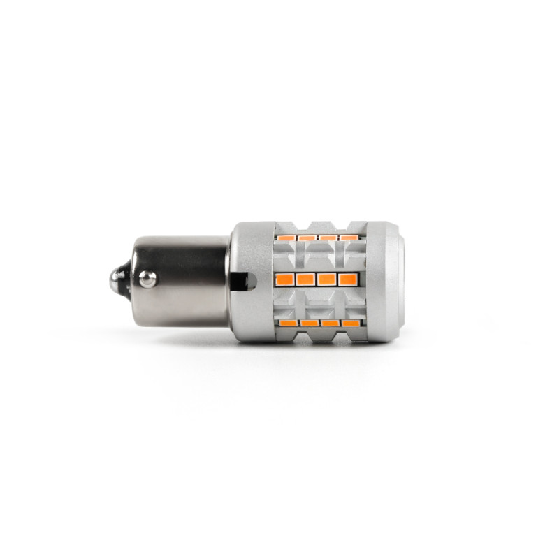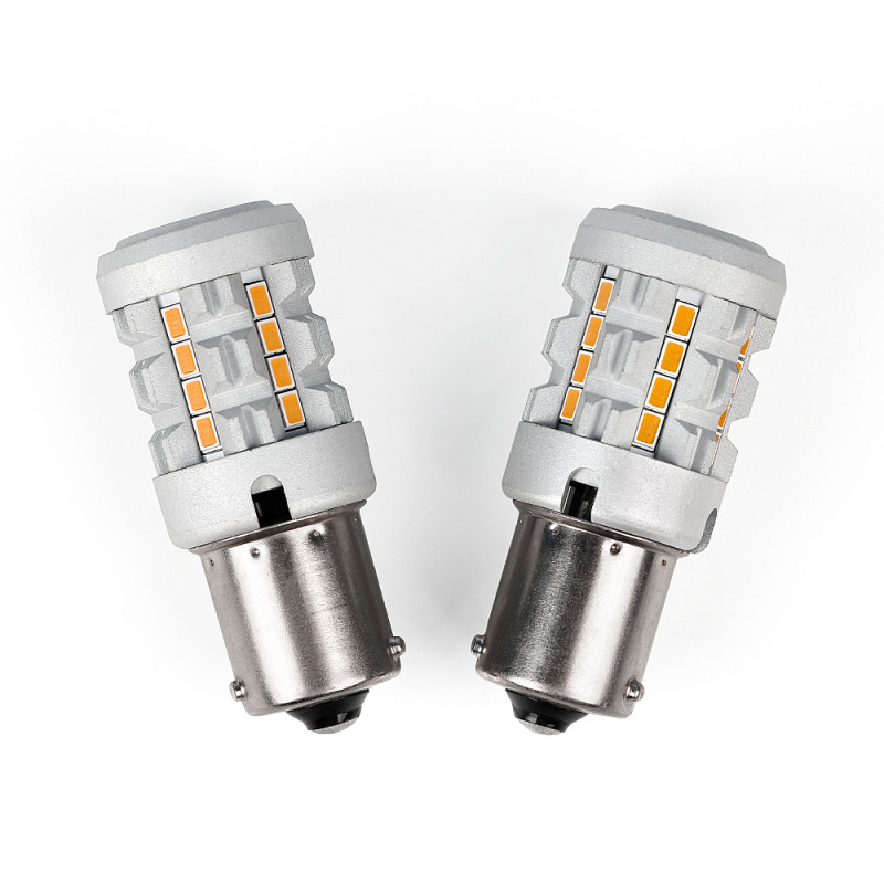 Nová generace LED autožárovek s paticí BAU15s, oranžová, 30x LED čip 3030SMD. Díky speciální vestavěné elektronice simuluje stejný odběr jako klasická žárovka a nehlásí chybu ve vozidlech se systémem hlídání prasklých žárovek. Určeno do směrových světel (blinkrů), žárovky blikají správnou rychlostí.
